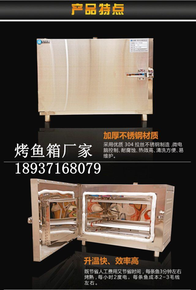 1. 烤魚(yú)箱采用高質(zhì)量304拉絲不銹鋼制造,耐腐蝕,設(shè)計(jì)豪華,熱效高、清洗方便、易維護(hù),,而且具有熱穿透力強(qiáng)、節(jié)能省電、使用壽命長(zhǎng)、操作安全、更換簡(jiǎn)單等特點(diǎn).是您理想的燒烤設(shè)備符合現(xiàn)代人對(duì)飲食的欣賞水平及制作出的對(duì)美食口感的要求! 擺脫了碳烤同時(shí)烤多條魚(yú)的粗獷式烤魚(yú)方法,現(xiàn)在行業(yè)內(nèi)烤魚(yú)開(kāi)始向?qū)R,環(huán)保,精細(xì)方面發(fā)展,老式的碳烤箱,占地面積大,時(shí)間比較長(zhǎng),客人等的比較著急,使用木炭,難以做到干凈衛(wèi)生環(huán)保、并且一個(gè)人操作起來(lái)很不方便,時(shí)效差,效率低,同時(shí)多條烤魚(yú),受熱不均勻,溫度控制不靈活,不能夠有效地掌控溫度,調(diào)整烘烤的效果!多條魚(yú)同時(shí)烤,容易造成受熱不均,烤熟程度不一致!很難統(tǒng)一口味!